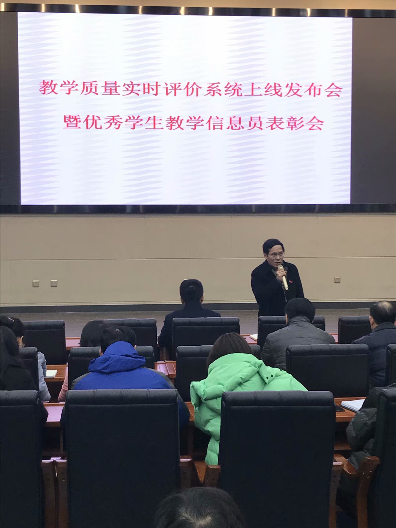 12月25日下午,我校在北C105组织召开教学质量实时评价系统上线发布会暨优秀学生教学信息员表彰会,各学院教学院长和教学秘书、教务处、学生工作处和教育教学评估中心相关工作人员及部分学生代表参加了会议,汪胜前副校长出席发布会并作讲话,会议由教育评估中心主任何习平主持。